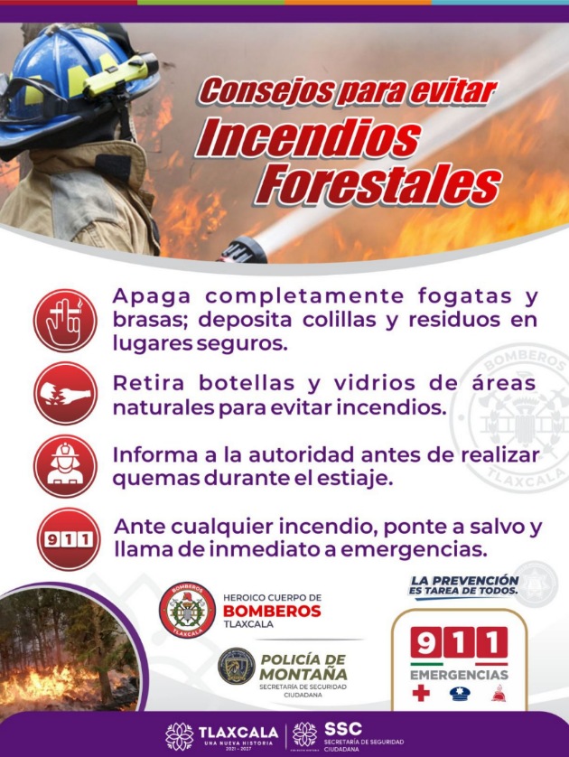 Con el propósito de proteger la vida y el patrimonio de las y los tlaxcaltecas, así como de preservar los recursos naturales del estado, el H. Cuerpo de Bomberos de la Secretaría de Seguridad Ciudadana (SSC) emite una serie de recomendaciones para la prevención de incendios, los cuales suelen incrementarse durante la temporada de estiaje y las altas temperaturas.