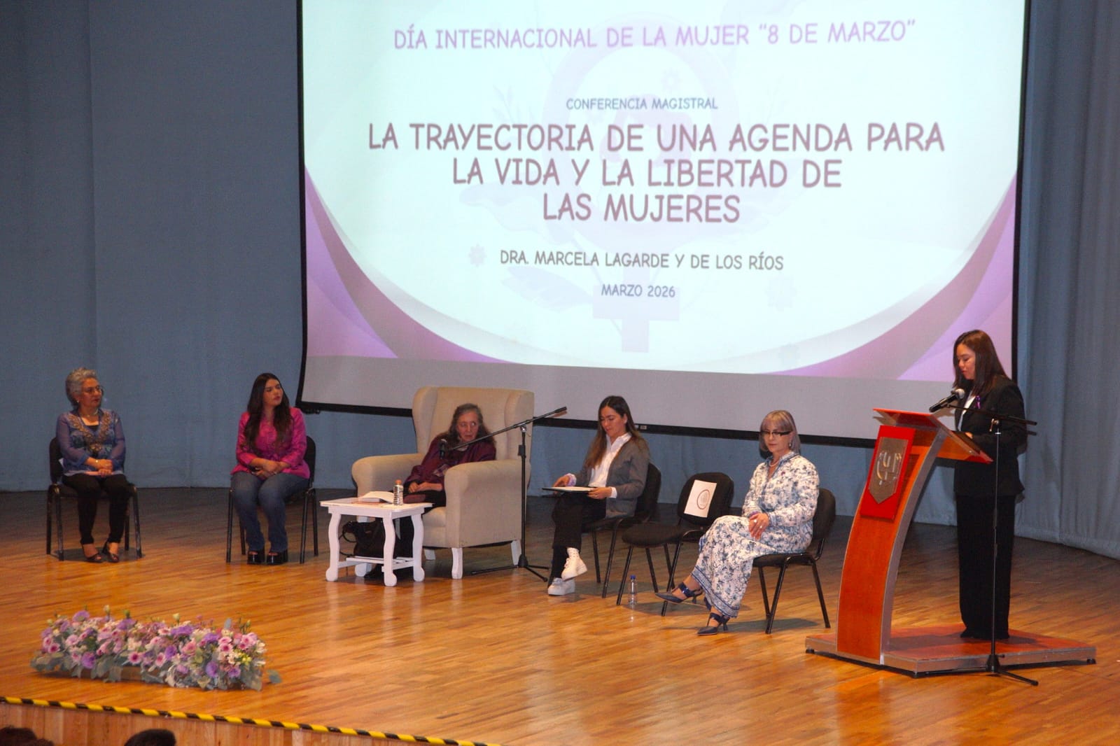 La conmemoración del Día Internacional de la Mujer en 2026 ubica como temas sobresalientes los derechos, la justicia y las acciones, consideró el Doctor Serafín Ortiz Ortiz, Rector de la Universidad Autónoma de Tlaxcala (UATx), al dar la bienvenida a la Doctora Marcela Lagarde y de los Ríos, académica e investigadora mexicana y destacada especialista en feminismo latinoamericano, quien dictó la conferencia magistral “Trayectoria de una agenda para la vida y la libertad en las mujeres”, en el Teatro Universitario.