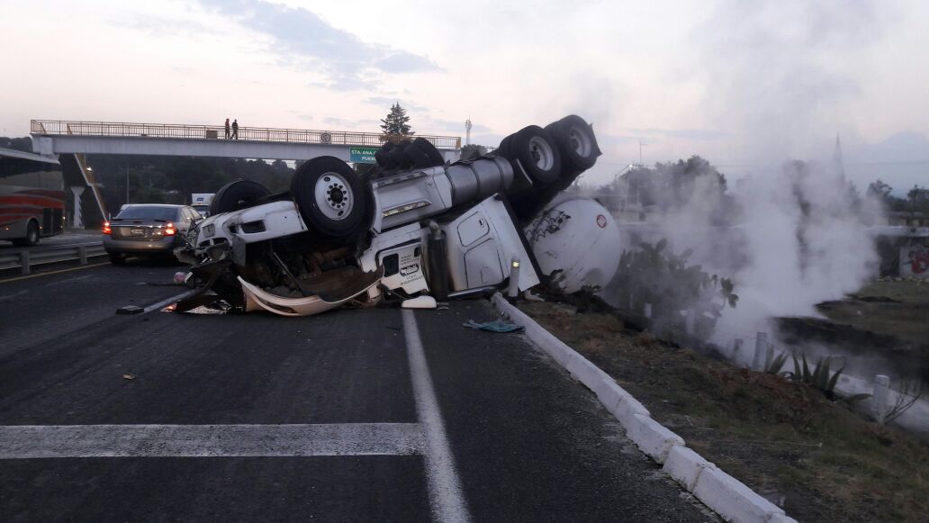 Tráiler con pipa vuelca y provoca tráfico vial en la Apizaco-Tlaxcala