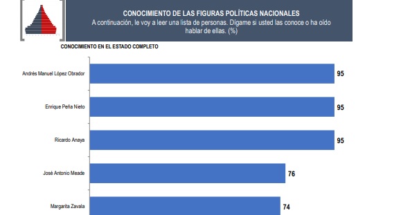 Lo anterior, debido a que Anaya Cortés y López Obrador registran un nivel de conocimiento entre la población del 95%, mientras que el de Meade es del 76%.