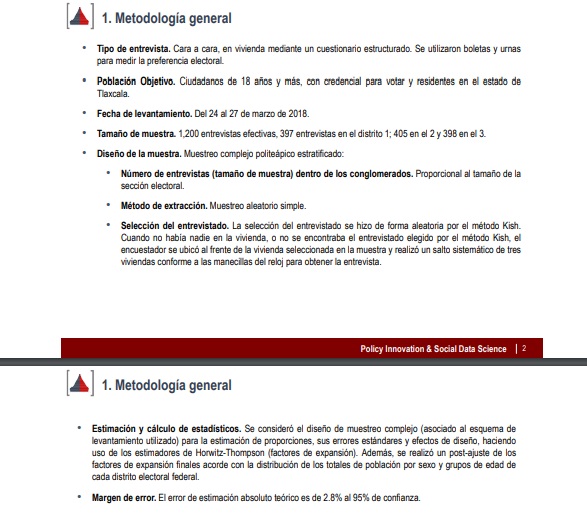 Cabe mencionar que la encuesta tiene un margen de error de 2.8% y un nivel de confianza del 95%. Se efectuó cara a cara, en vivienda, mediante un cuestionario estructurado, y se utilizaron boletas y urnas. Se aplicó a ciudadanos de 18 años y más, con credencial para votar y residentes en el estado y se levantó del 24 al 27 de marzo de 2018.
