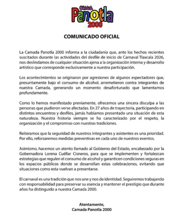 Panotla 2000 emitió un comunicado oficial en el que lamentó profundamente lo