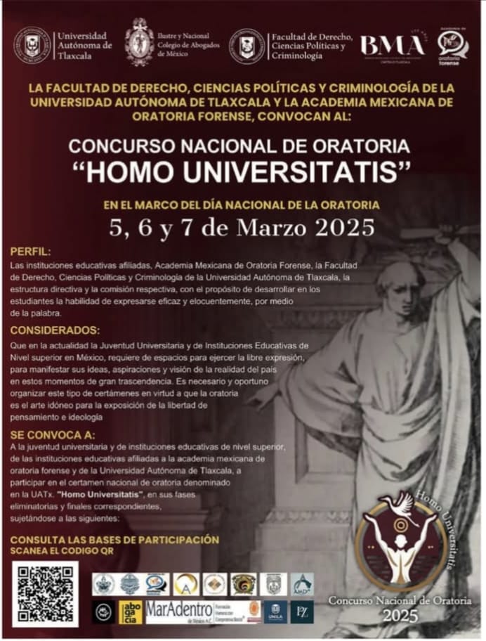 En el mes de marzo la Universidad Autónoma de Tlaxcala (UATx) será sede del concurso nacional de Oratoria “Homo Universitatis” que tiene como propósito fomentar la oralidad entre estudiantes de diversas disciplinas y promover el diálogo y la cultura, bajo la organización de la Facultad de Derecho, Ciencias Políticas y Criminología, la Barra Mexicana Colegio de Abogados (BMA), la Academia Mexicana de Oratoria Forense y diferentes universidades del país, en el marco del Día Nacional de la Oratoria.