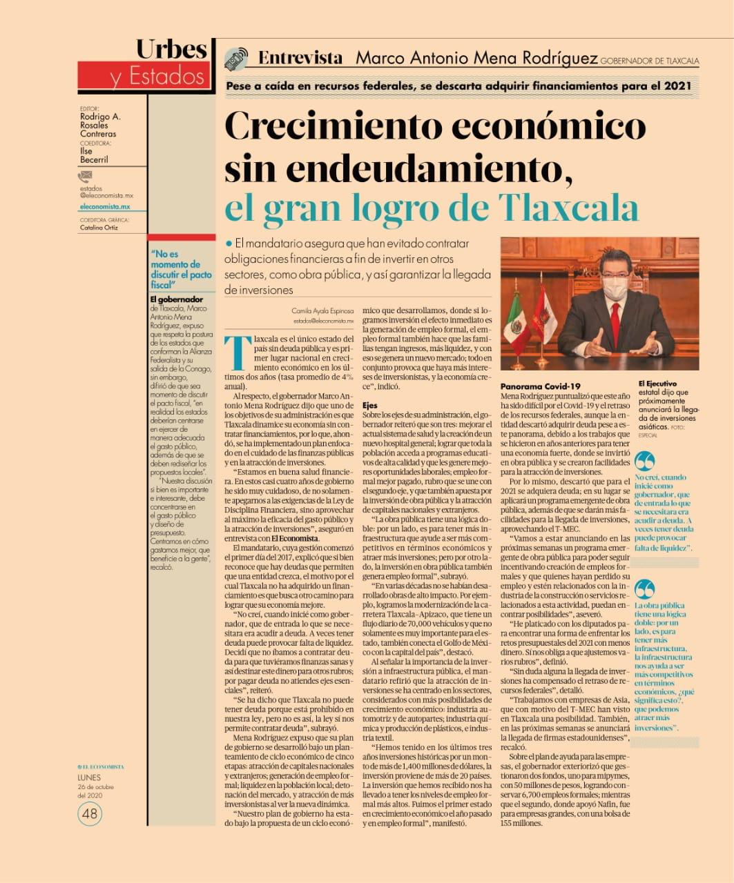“Estamos en buena salud financiera. En estos casi cuatro años de gobierno he sido muy cuidadoso, de no solamente apegarnos a las exigencias de la Ley de Disciplina Financiera, sino aprovechar al máximo la eficacia del gasto público y la atracción de inversiones”, aseguró en entrevista con El Economista.