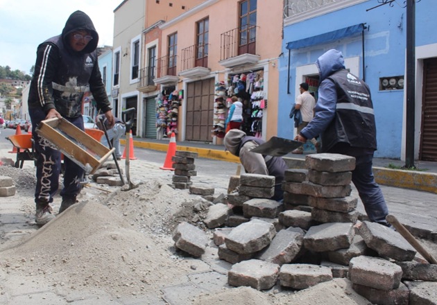 Como parte de estas labores integrales, en la calle Zitlalpopócatl, en la colonia Centro, se llevó a cabo la nivelación de adoquines, atendiendo una demanda ciudadana de esta zona de la capital.
