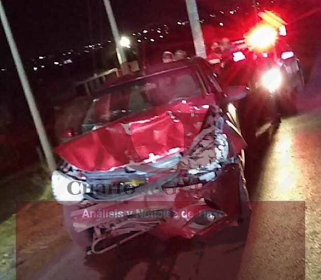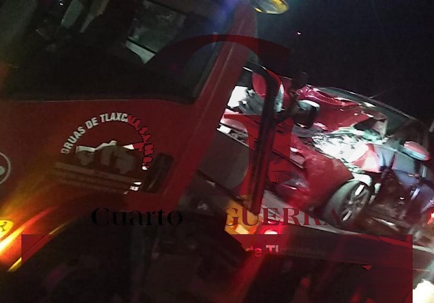 Finalmente, después de las 03:00 horas, en la carretera Apizaco-Huamantla, a la altura de la comunidad de El Cuernito, frente a una plaza comercial, un vehículo compacto de color rojo colisionó de frente contra otro vehículo hasta el momento no identificado, haciendo que diera varios giros hasta quedar detenido a contraflujo, arribando hasta el lugar elementos de la policía estatal para constatar que no hubiera afectaciones en los pasajeros de la unidad, siendo retiradas todas las unidades siniestradas por diversos servicios de grúas.