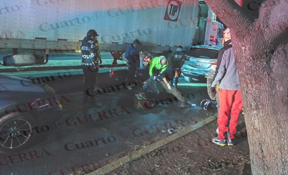 ¡De milagro vive! Motociclista termina debajo de una camioneta tras chocar contra un tráiler