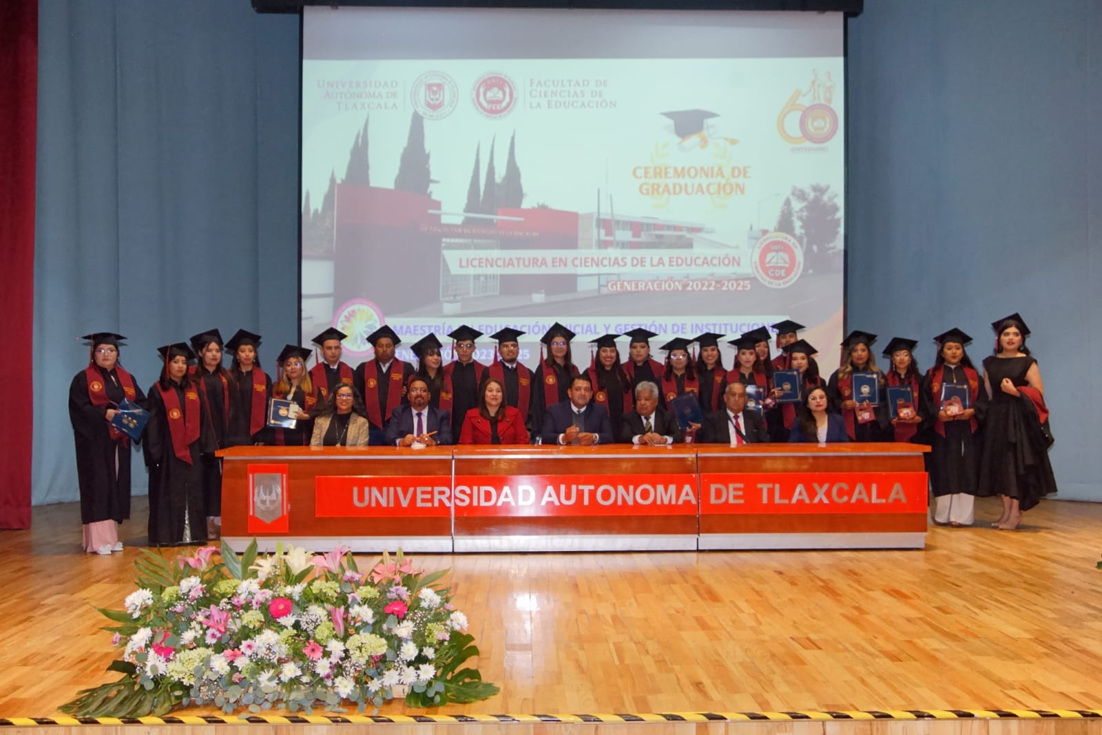 En solemne ceremonia celebrada en el Teatro Universitario, 59 egresados de la Licenciatura en Ciencias de la Educación, generación 2022-2025, y 13 de la Maestría en Educación Inicial y Gestión de Instituciones, generación 2023-2025, de la Facultad de Ciencias de la Educación de la Universidad Autónoma de Tlaxcala (FCE-UATx) recibieron la constancia que avala la conclusión de su formación.