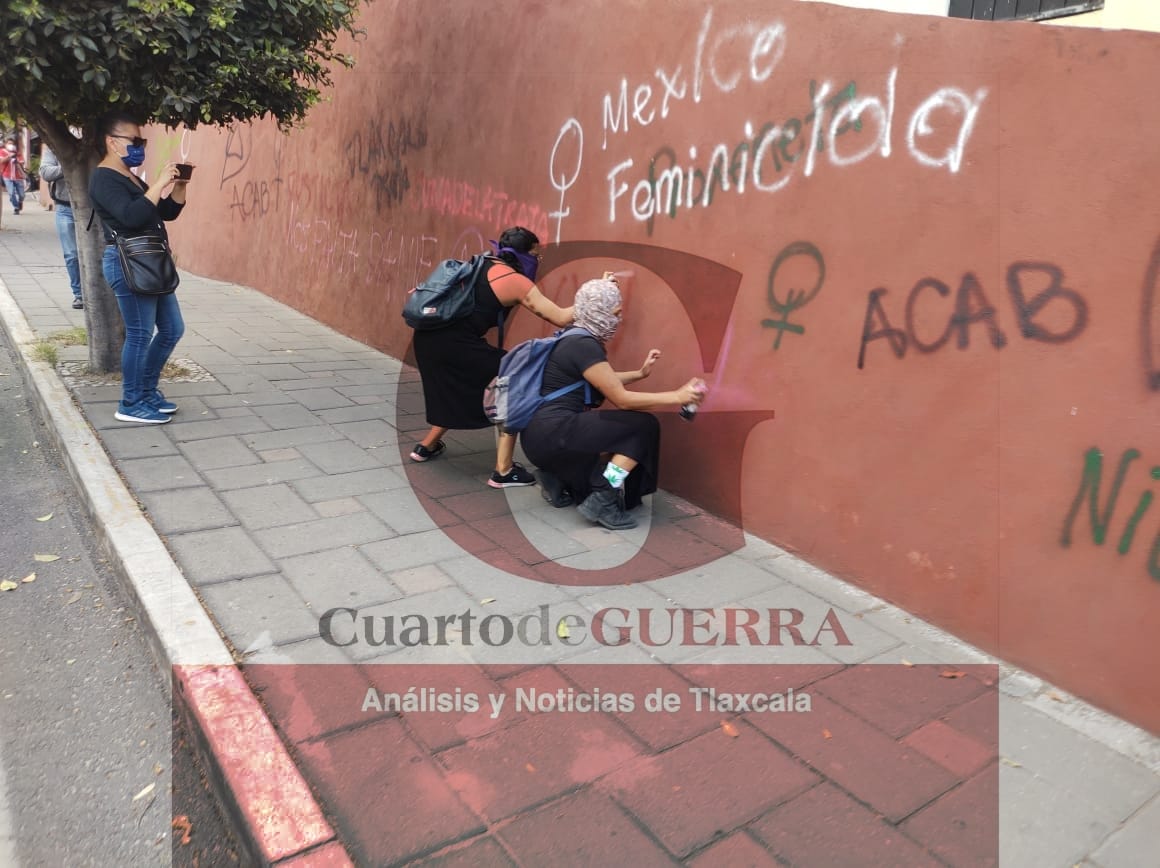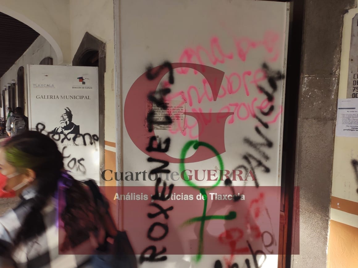 Feministas vandalizan inmuebles públicos en el zócalo de Tlaxcala
