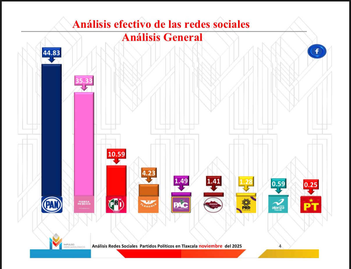 De acuerdo con el estudio, correspondiente a noviembre de 2025, el PAN encabeza el análisis general con 44.83 puntos, resultado que lo coloca como líder absoluto en alcance, interacción y presencia dentro de las plataformas digitales.
