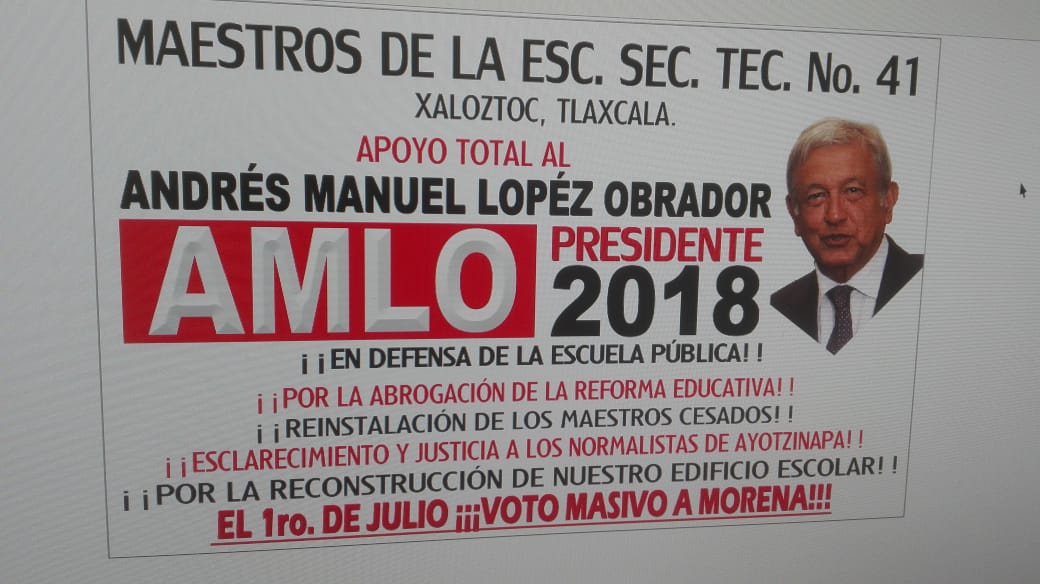 Cabe señalar que el directivo sería uno de los firmantes del desplegado publicado ayer en un diario de circulación estatal en el que, además de convocar a jóvenes y mujeres a los mítines de López Obrador, llamaron a docentes insaculados para la evaluación docente a no presentar examen, pues aseguran que es ilegal -aun cuando las autoridades judiciales ya determinaron que no es así- y que la Reforma Educativa será cancelada tras las elecciones -lo que es falso, porque para ello se requiere un proceso legislativo-.