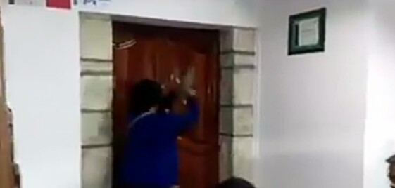 Con palos y bates pobladores causan destrozos y rompen la puerta de la oficina del alcalde de Chiautempan, Héctor Domínguez Rugerio.
