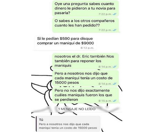 “También se han atrevido a solicitar apoyo económico para mejorar la calificación y/o pasarnos la materia y para reposición de material de práctica. En estos días algunos alumnos han sido citados por el coordinador para pedirles $590 pesos por materia reprobada, que serán utilizados supuestamente para reponer maniquíes anatómicos que se perdieron. Y la semana pasada uno de los docentes nos citó a 25 alumnos para pedirnos 160 pesos como cooperación para esos maniquíes”.
