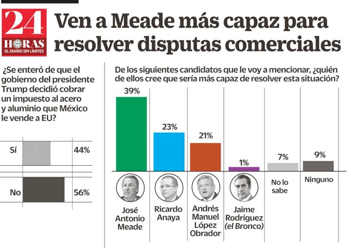 El candidato de la coalición Todos por México, José Antonio Meade, es percibido como el abanderado más capaz para resolver la disputa comercial entre México y Estados Unidos, de acuerdo a una encuesta telefónica levantada ayer.