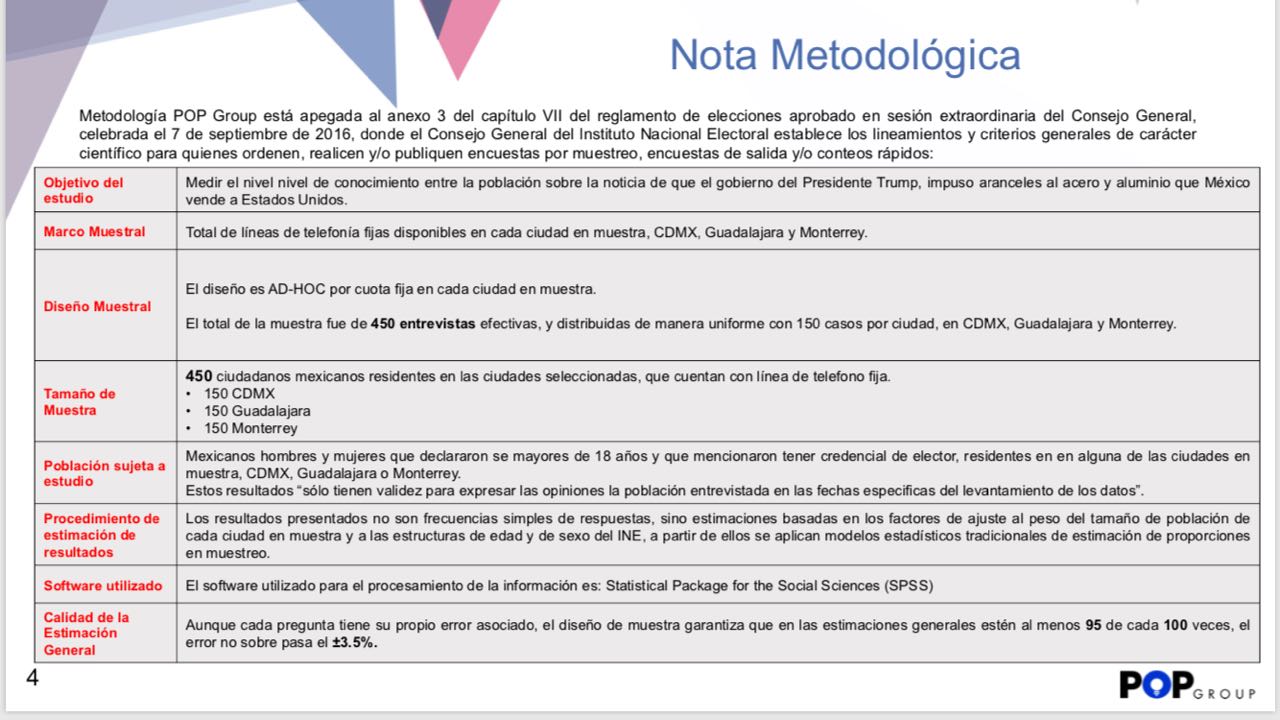 Pop Group precisó que el total de la muestra fue de 450 entrevistas efectivas, y distribuidas de manera uniforme con 150 casos por ciudad, en la CDMX, Guadalajara y Monterrey.
