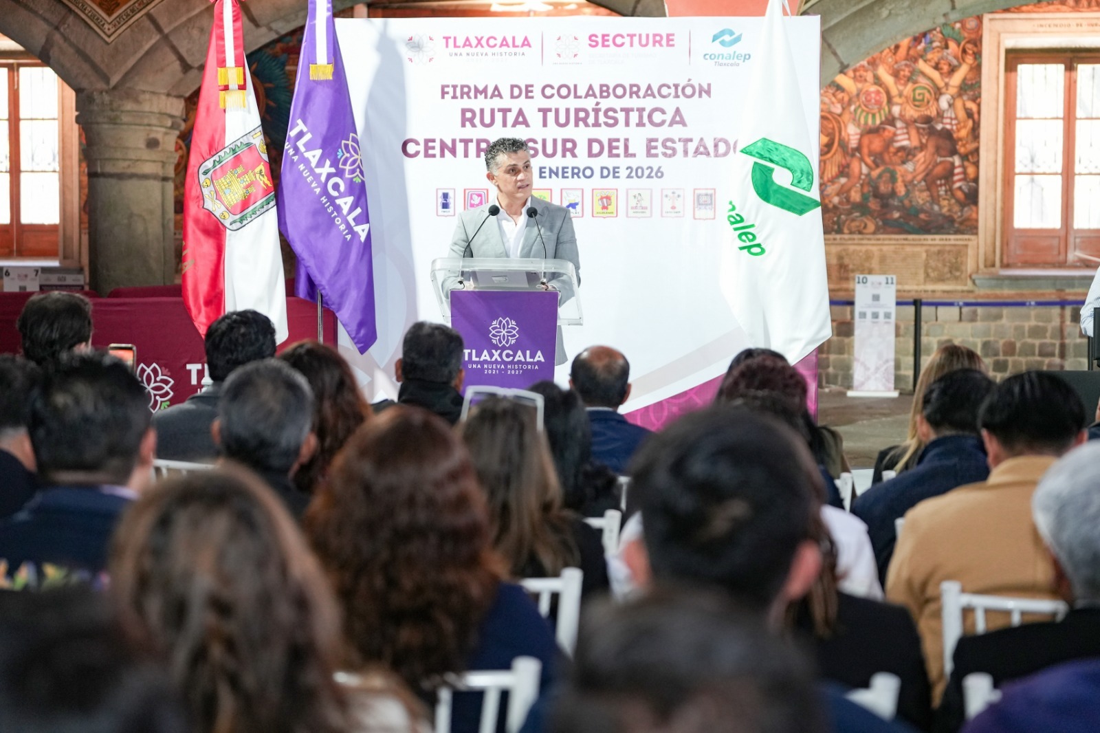 Con el propósito de fortalecer el desarrollo turístico, cultural y económico de la región, el presidente municipal de Tlaxcala, Alfonso Sánchez García, participó en la firma del Convenio de Colaboración de la Ruta Turística Centro-Sur del estado, una estrategia conjunta que integra esfuerzos del gobierno estatal, la Secretaría de Turismo, CONALEP Tlaxcala y nueve municipios, entre ellos la capital.
