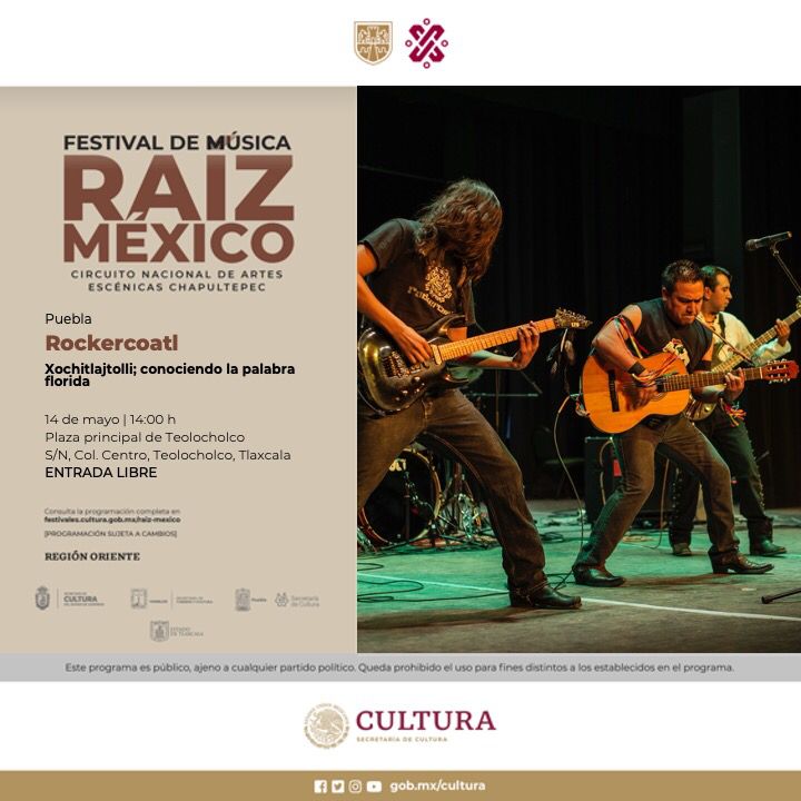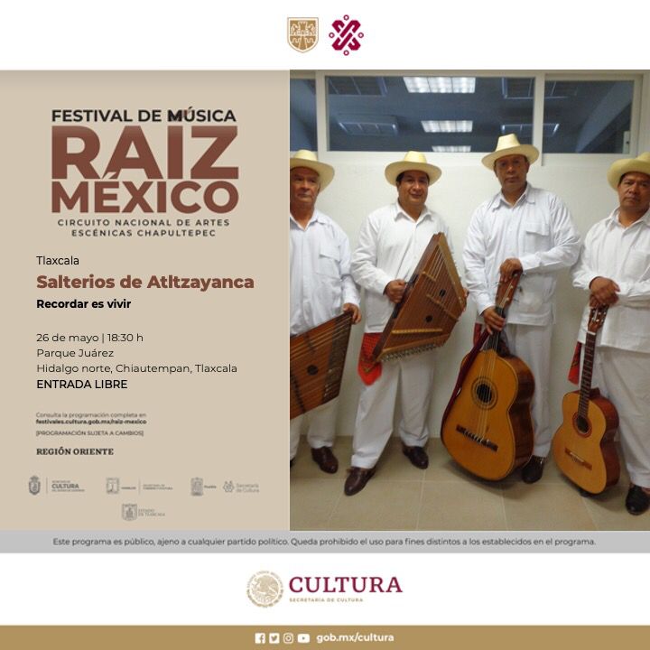 Sigue las redes sociales de la Secretaría de Cultura en Twitter (@cultura_mx), Facebook (/SecretariaCulturaMX) e Instagram (@culturamx) y Música Raíz México en Facebook (/MusicaRaizMexico).