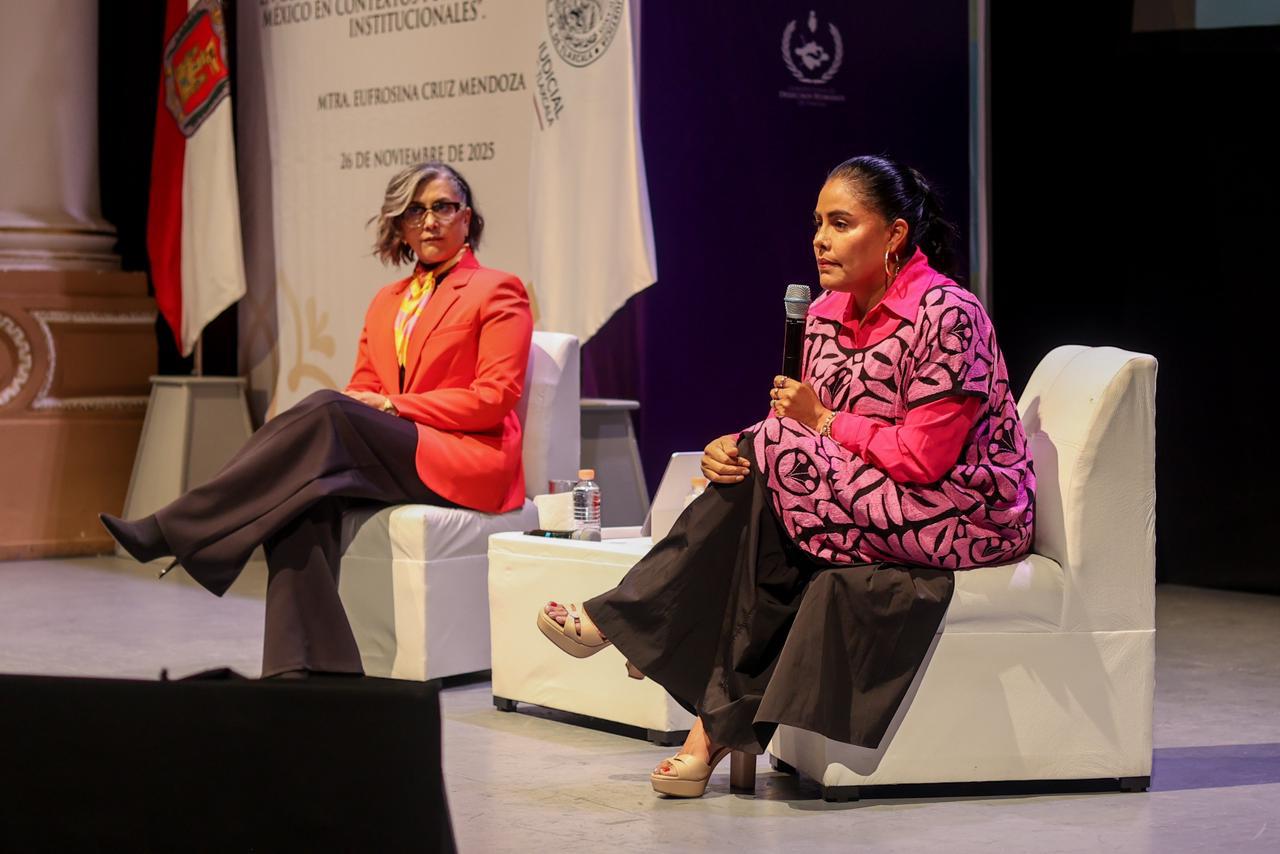 En el Teatro Xicohténcatl, Lorena Cuéllar destacó la labor de Eufrosina Cruz Mendoza, activista y defensora de los derechos de las mujeres y comunidades indígenas, quien con su lucha contribuyó a la transformación de la conciencia social en México.