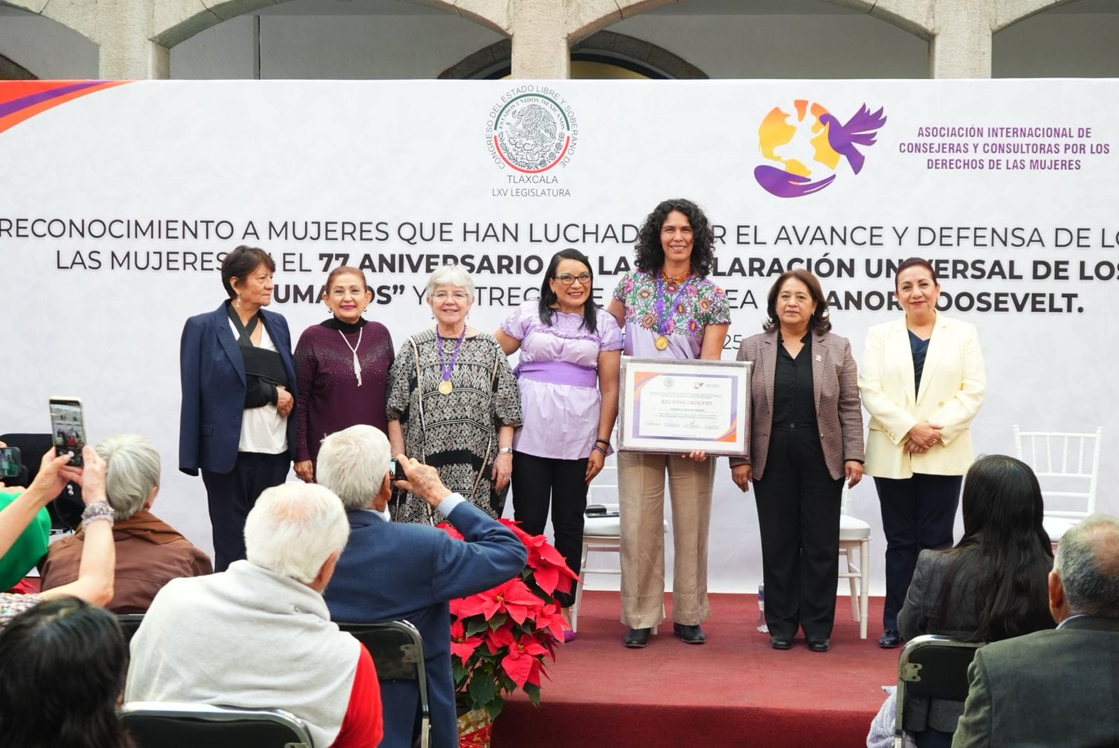 Las diputadas María Ana Bertha Mastranzo Corona y Laura Yamili Flores Lozano acompañaron a la Asociación Internacional de Consejeras y Consultoras por los Derechos de las Mujeres en la entrega de la presea “Eleanor Roosevelt”, un reconocimiento que distingue la trayectoria y méritos de mujeres que han impulsado la defensa y el avance de los Derechos de las Mujeres, en el marco del septuagésimo séptimo aniversario de la Declaración Universal de los Derechos Humanos.