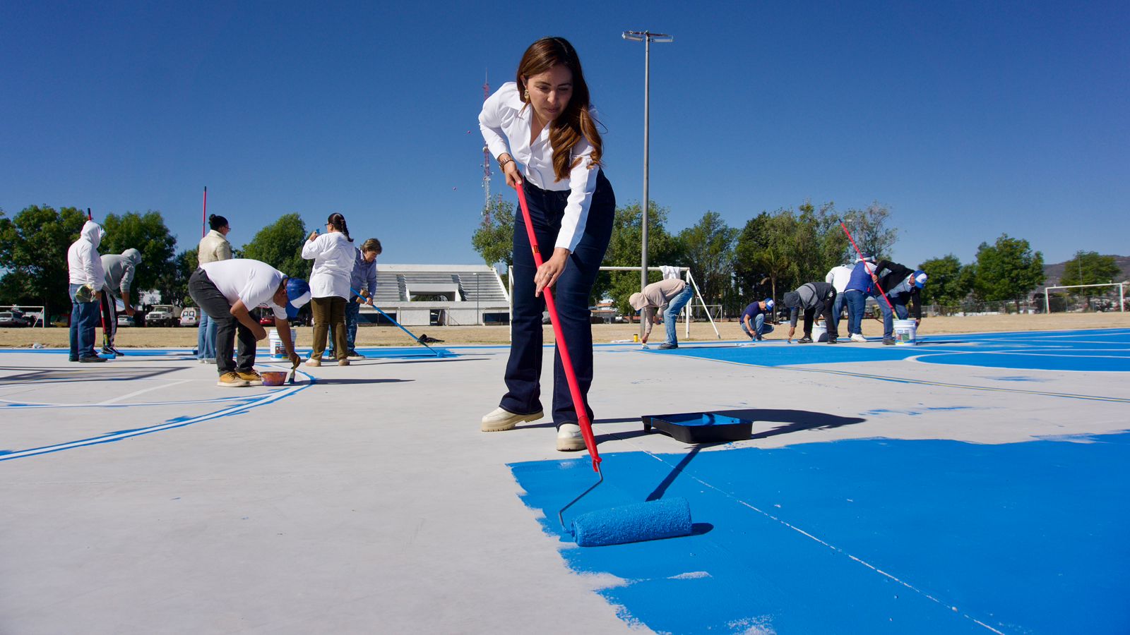 Ciudadanos integrantes del comité municipal Aquí Nadie Se Raja participaron aplicando pintura para embellecer el espacio y delimitar correctamente las áreas deportivas, fortaleciendo el trabajo en equipo entre sociedad y representación legislativa.