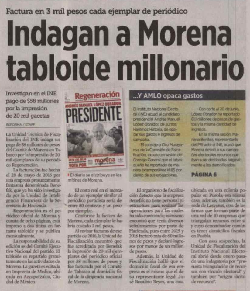 Al revisar facturas de ese partido de 2016, la Unidad de Fiscalización encontró que fue acreditada por Benefak la impresión de 20 mil ejemplares del periódico oficial por 58 millones de pesos y fue facturada por el Comité de Tabasco al domicilio fiscal de la dirigencia nacional de Morena.
