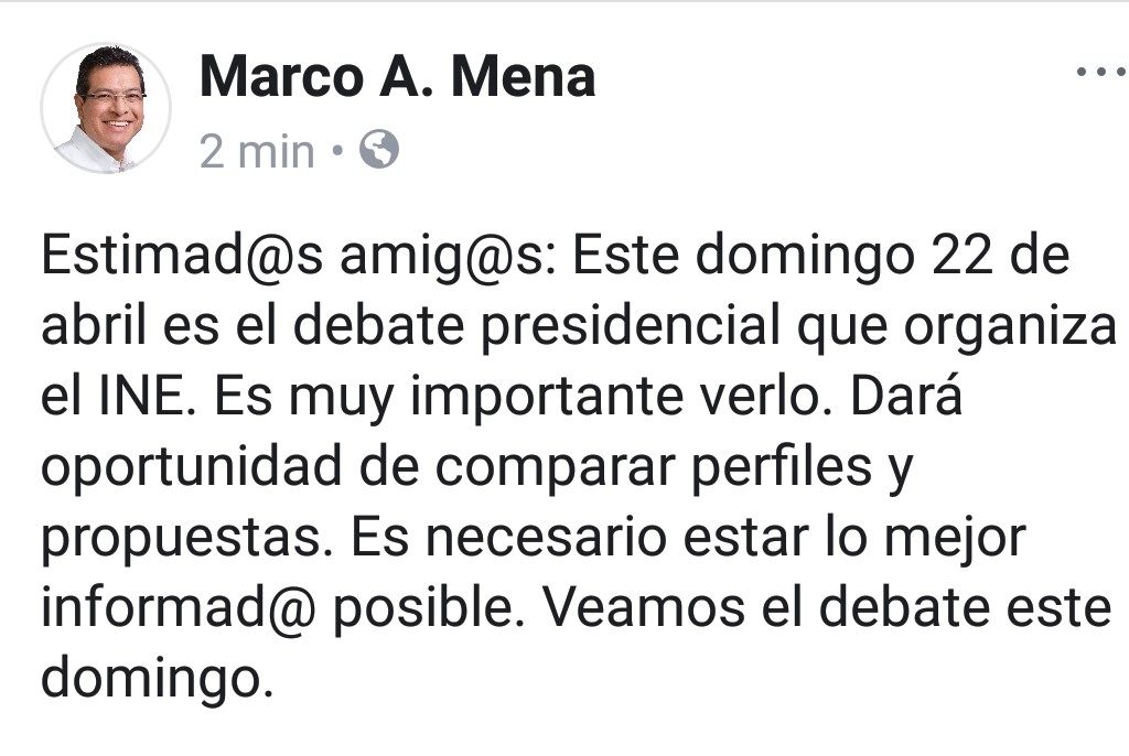 En su cuenta de Facebook, el Gobernador Mena escribió: “Este domingo 22 de abril es el debate presidencial que organiza el INE. Es muy importante verlo. Dará oportunidad de comparar perfiles y propuestas”.